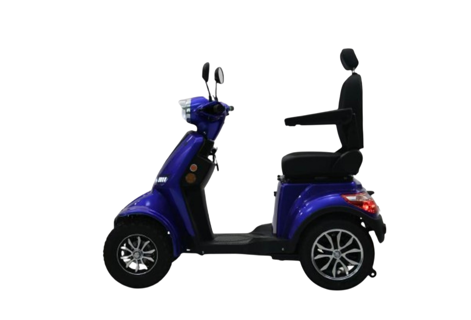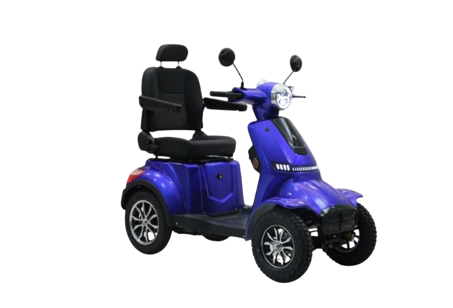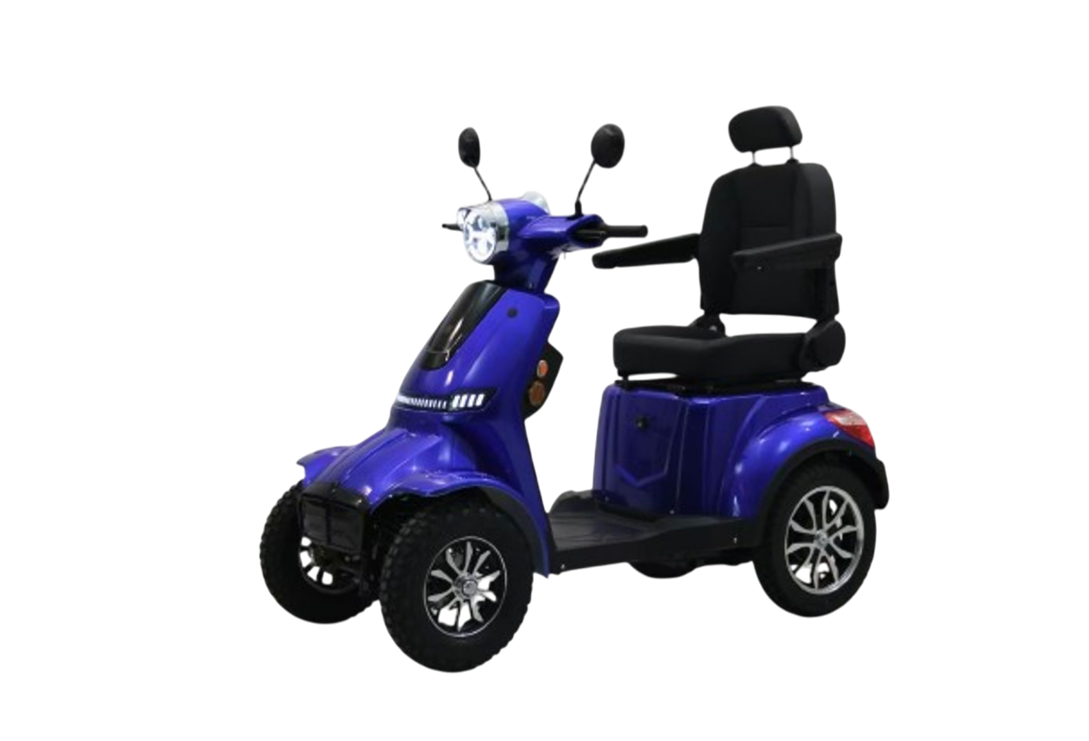En blå 4-hjulet elscooter giver dig en kombination af komfort, stabilitet og stilrent design. Den er ideel til daglige ture, transport i lokalområdet og til dig, der ønsker større frihed i hverdagen.